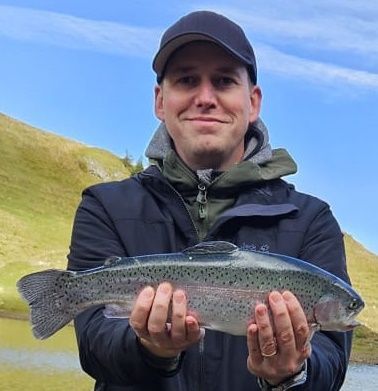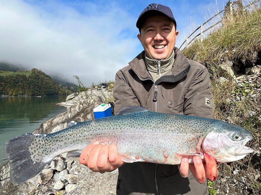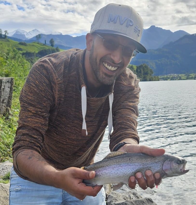 Jovan Maksimovic mit Lungernsee-Regenbogenforelle 46 cm